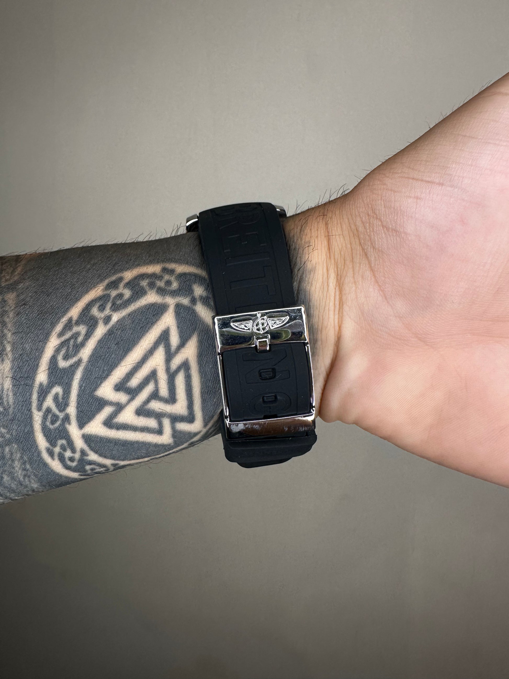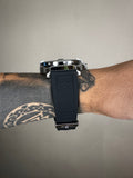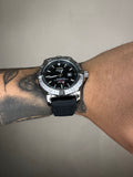 Caixa em aço 904l e pulseira em borracha.