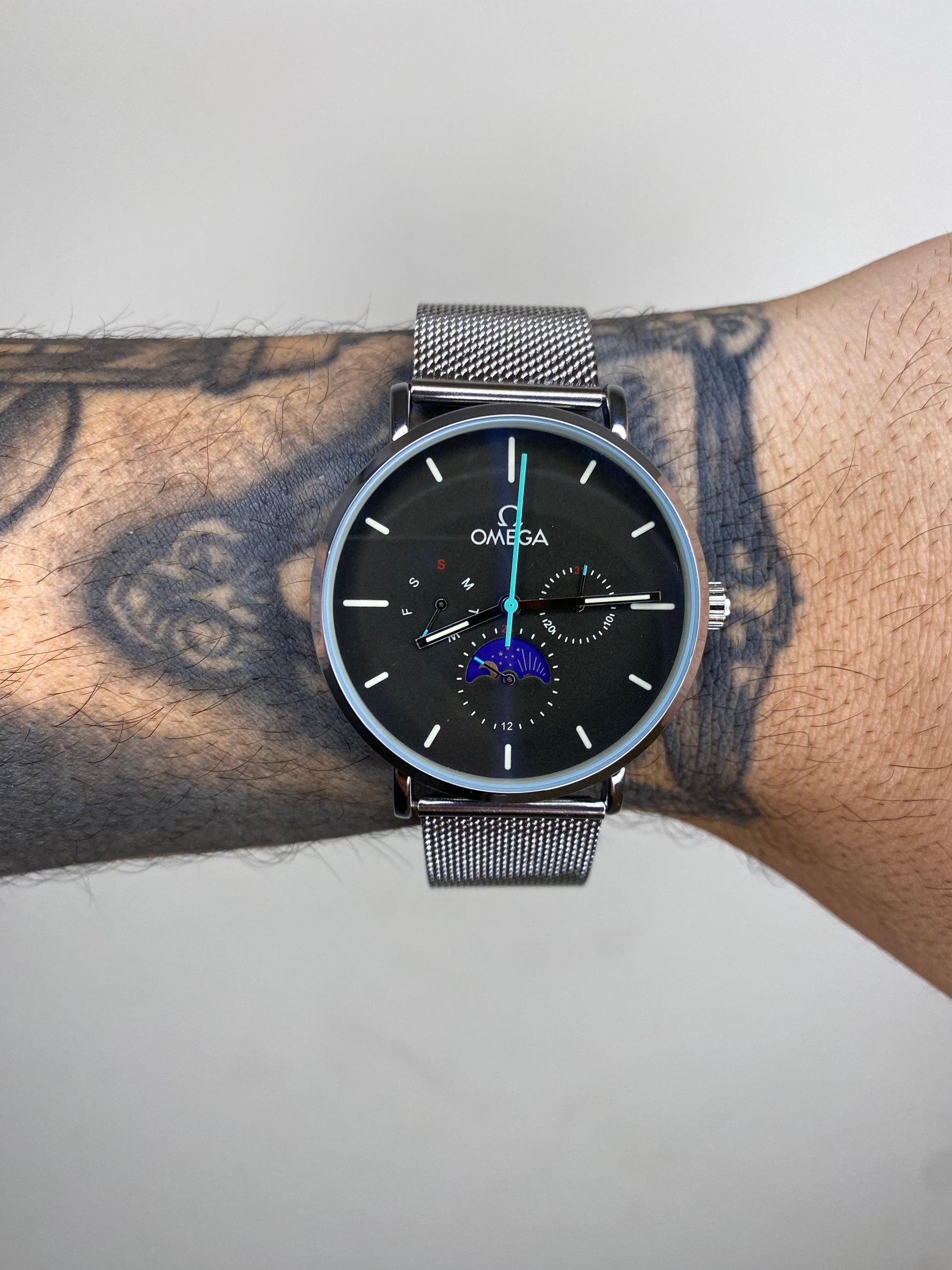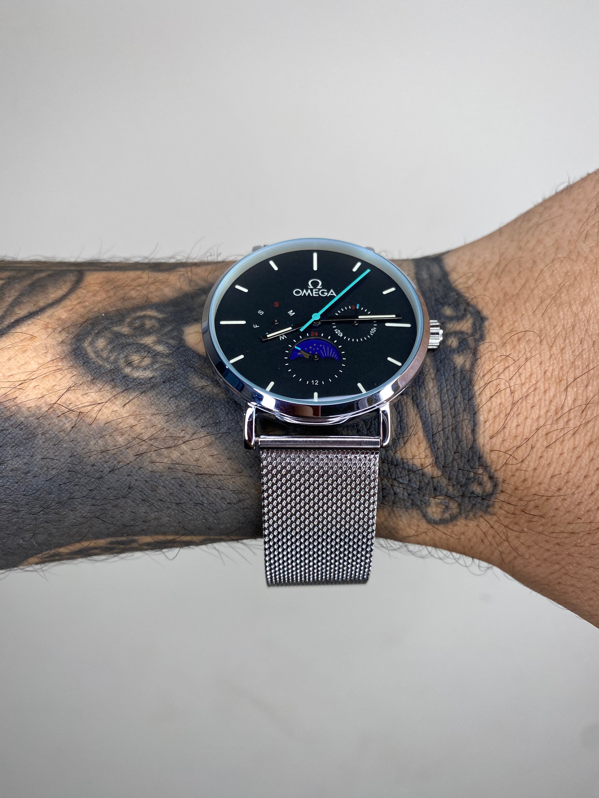 OMEGA MEIA LUA PRATEADO FUNDO PRETO