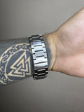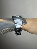 Caixa em aço e pulseira em aço inoxidável.
