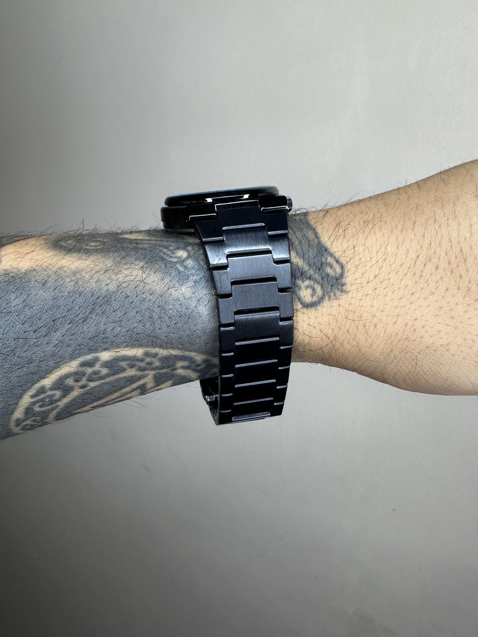 Caixa em aço e pulseira em aço inoxidável.